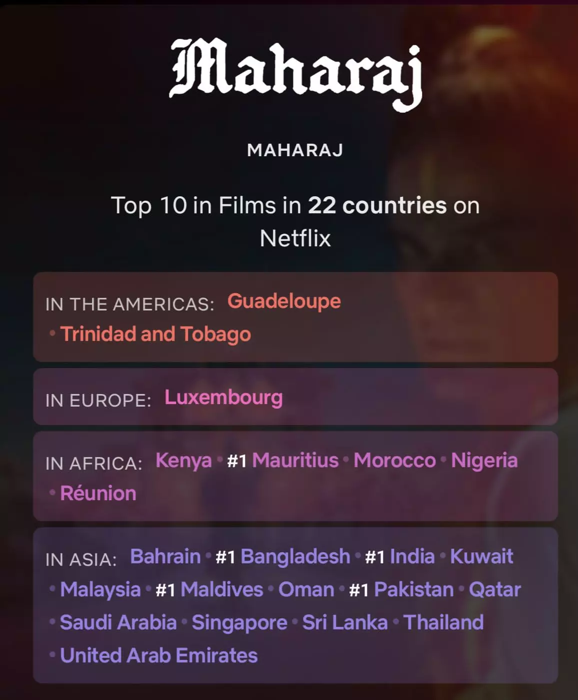 निर्देशक सिद्धार्थ पी मल्होत्रा ने इंस्टाग्राम पर पोस्ट कर लिखा, "माय फ़िल्म महाराज इज 1 इन इंडिया 2 इन द वर्ल्ड एंड हैज ऑलरेडी एंट्रेड द टॉप 10 लिस्ट इन 22 कन्ट्रीज."