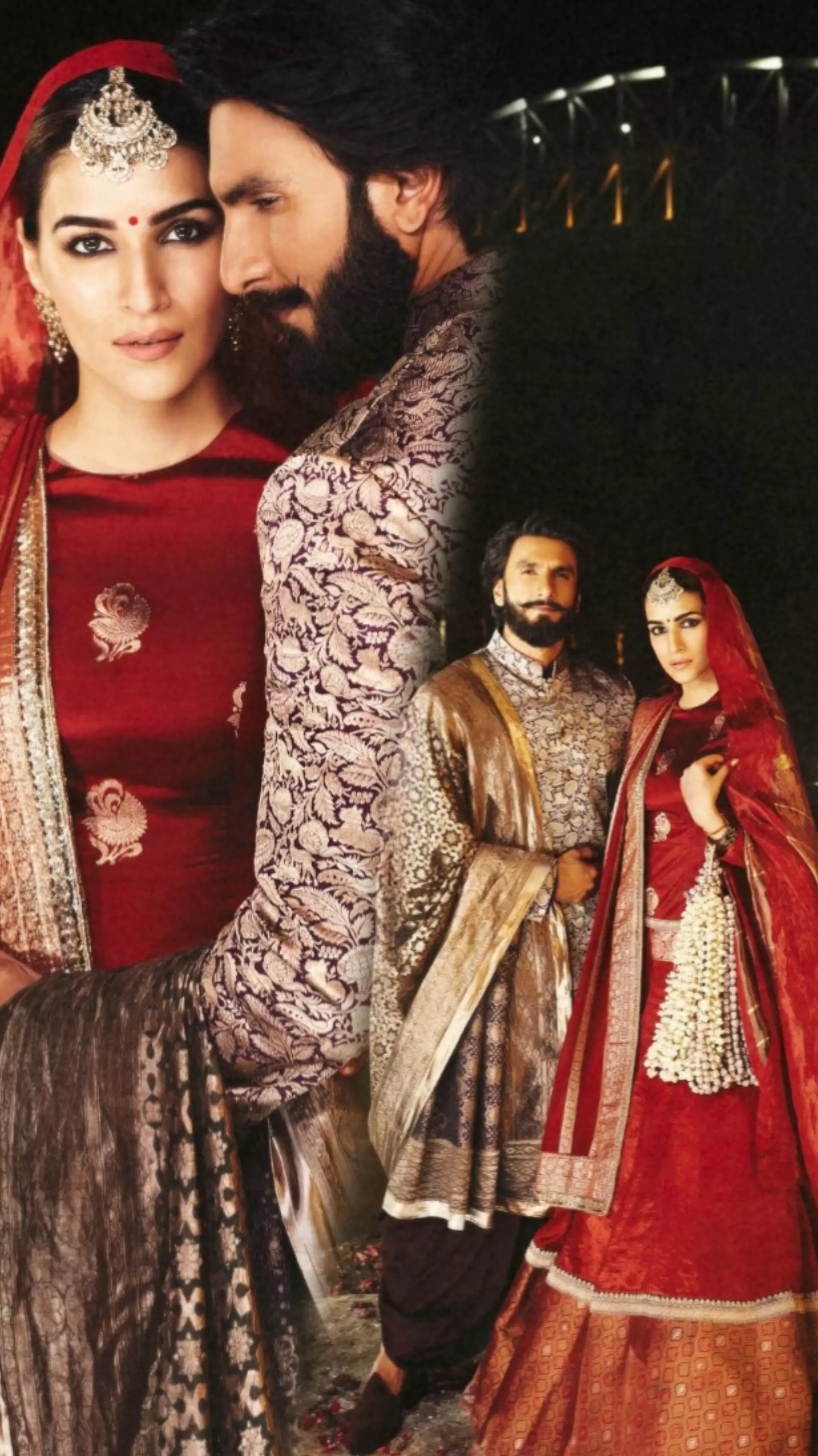 तस्वीरों में कृति सेनन ने लाल रंग का लहंगा पहना हुआ है, जबकि रणवीर सिंह ने सफेद रंग की शेरवानी पहनी हुई है। दोनों कलाकार नमो घाट पर गंगा नदी के किनारे खड़े हैं और मुस्कुरा रहे हैं।