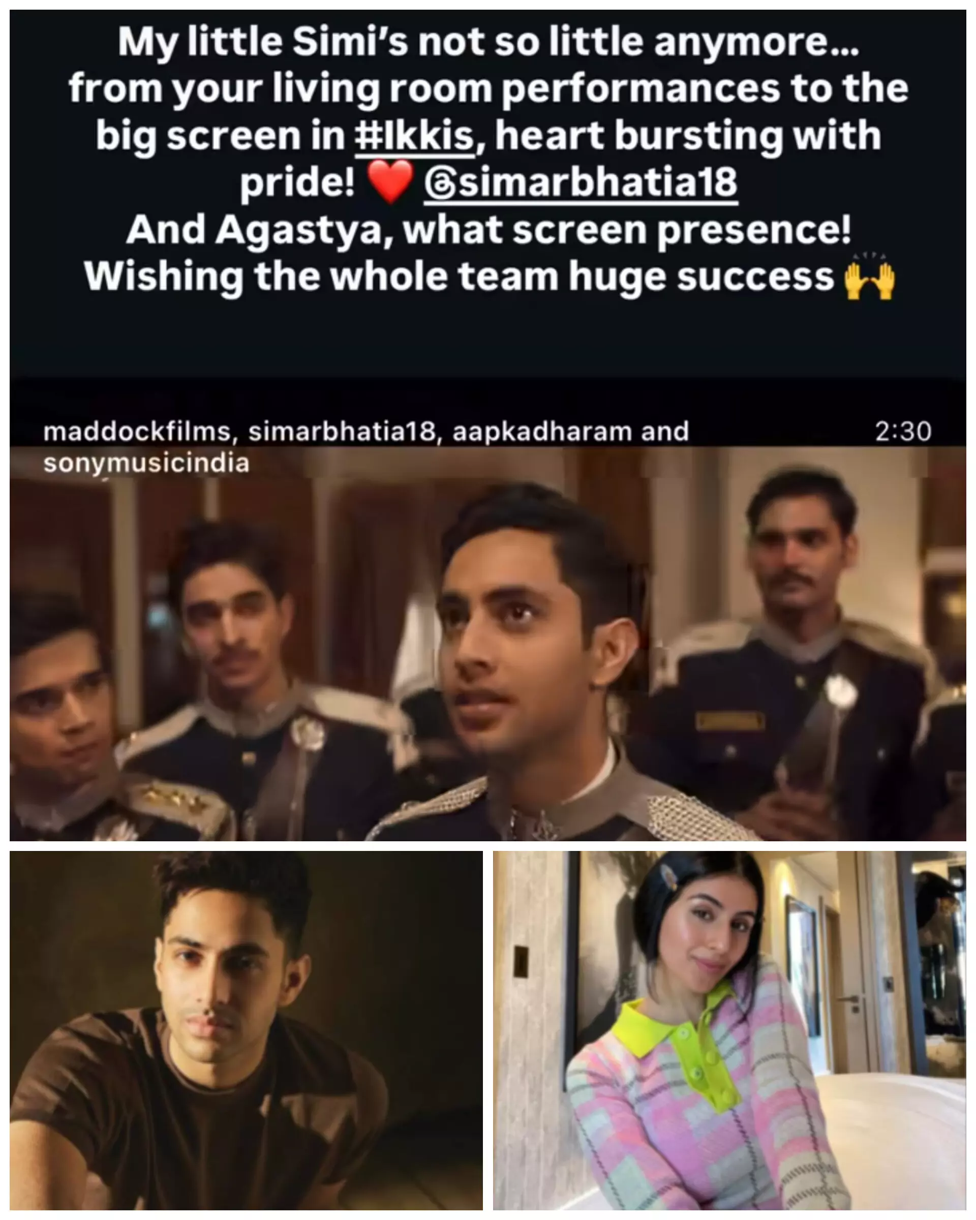 फिल्म ‘इक्कीस’ के ट्रेलर रिलीज के बाद अक्षय कुमार ने अपने इंस्टाग्राम अकाउंट पर एक भावुक पोस्ट साझा किया। उन्होंने सिमर और अगस्त्या की तारीफ करते हुए लिखा— “मेरी छोटी सिमी अब इतनी छोटी नहीं रही। तुम्हारे लिविंग रूम परफॉर्मेंस से लेकर ‘इक्कीस’ के बड़े पर्दे तक पहुंचना गर्व की बात है। दिल खुशी से भर गया है। सिमर भाटिया और अगस्त्य, तुम्हारी स्क्रीन प्रेजेंस शानदार है! पूरी टीम को सफलता की ढेर सारी शुभकामनाएं।”